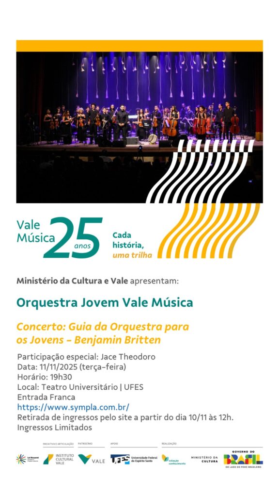 O evento integra as comemorações dos 25 anos do Projeto Vale Música Espírito Santo e conta com articulação do Instituto Cultural Vale e patrocínio da Vale, por meio da Lei Federal de Incentivo à Cultura.